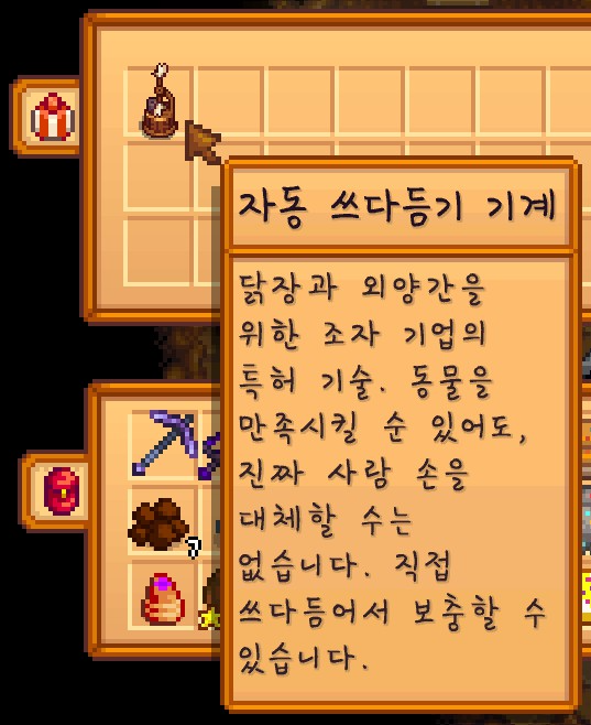 그리고 자동 쓰다듬기 기계도 얻었습니다. 이게 있으면 동물을 직접 쓰다듬지 않아도 어느 정도 쓰다듬어주기 때문에 귀찮은 일이 하나 더 줄어들게 되는데요.
