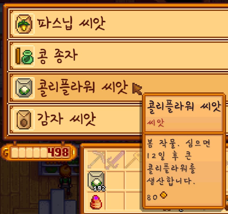 콜리플라워 씨앗을 샀습니다. 이게 제일 비싸다보니 나중에 팔면 더 많이 벌 수 있기 때문이죠.