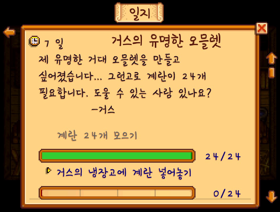 지금까지 달걀을 모으고 있었는데요. 거스의 퀘스트를 위해서 24개를 모으고 있었습니다.