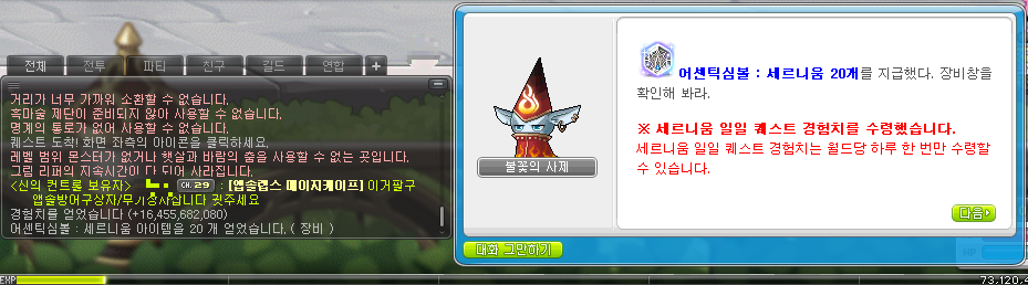아무튼 세르니움 일일 퀘스트를 해보니 경험치는 164억 정도 받을 수 있었습니다. 소멸의 여로부터 시작해서 세르니움까지 일일 퀘스트로 약 5~600억 정도 되겠네요.