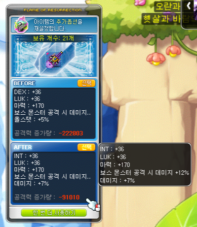 이벤트로 받은 검환불 180개 정도 사용을 하니 마력 2추, 보공 12%, 뎀 7%에 소소한 인트까지 뽑아냈는데요.