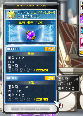이후 이벤트를 통해서 화이드 에디셔널 큐브 20개를 얻었는데요. 각각 엠블렘과 보조무기에 몇개 돌려보니 정말 운이 좋게 에픽으로 등업을 할 수 있었습니다.