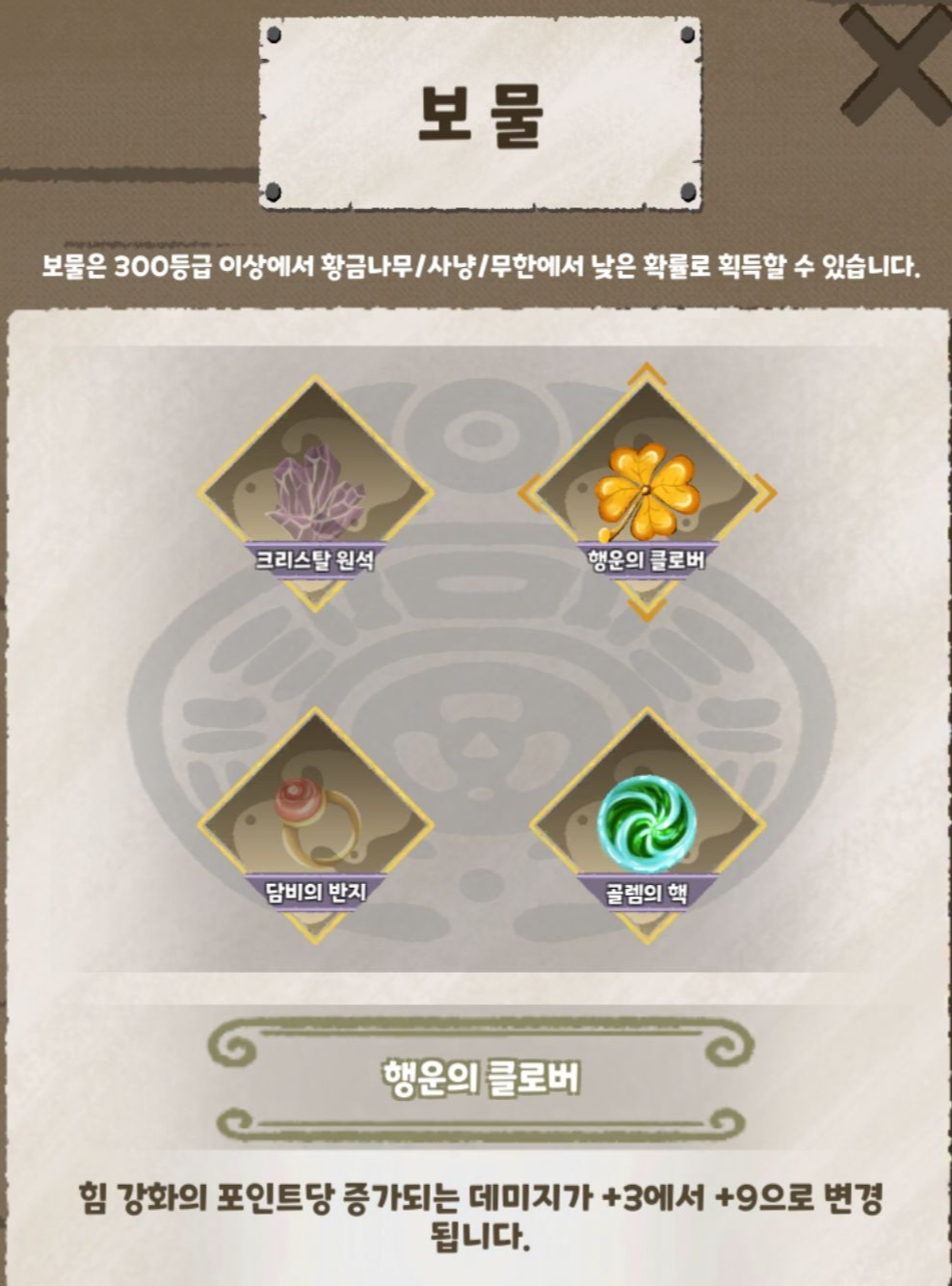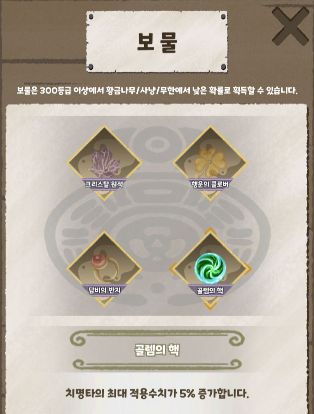 그리고 유물과 비슷한 시스템인 '보물'도 존재하는데요. 300등급 이후 황금나무/사냥/무한에서 낮은 확률로 나옵니다.
