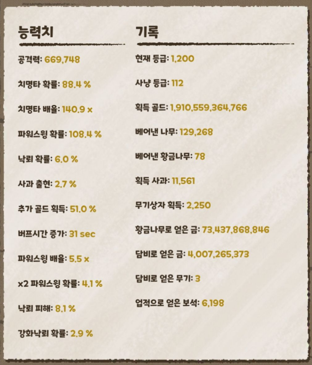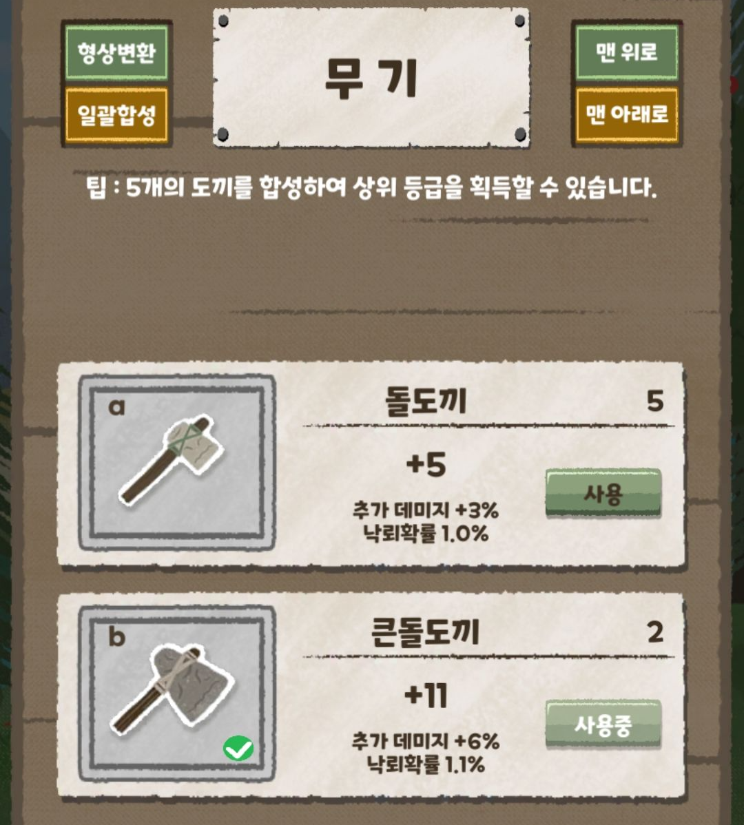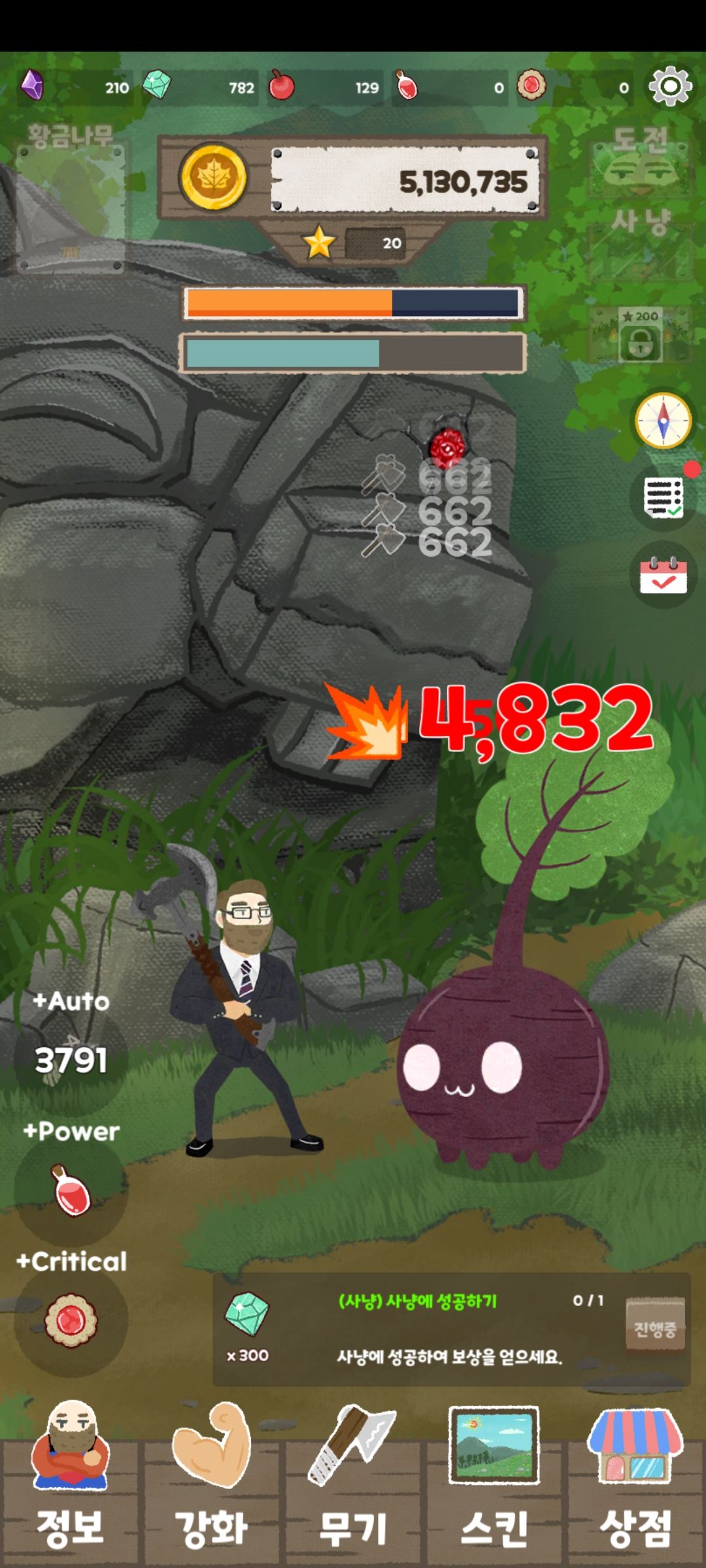 얻은 돈으로는 힘이나 치명타 확률/배율을 올려서 좀 더 원활하게 벌목을 할 수 있게 됩니다.