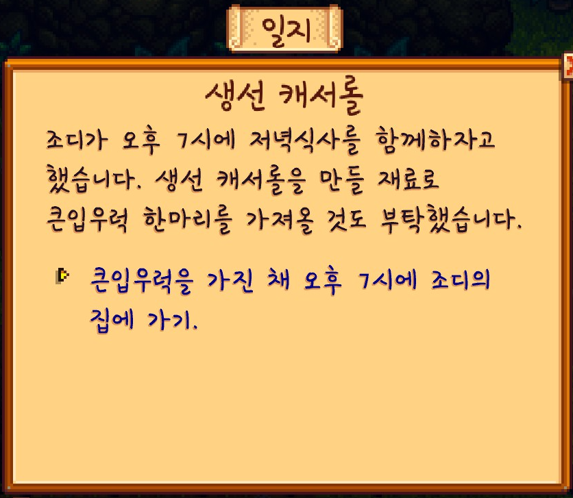 그동안 쌓아뒀던 퀘스트 중에서 저녁 식사를 같이 하기 위해서 큰입우럭을 가져오라는 퀘스트가 있어서 이걸 클리어하기로 했습니다.