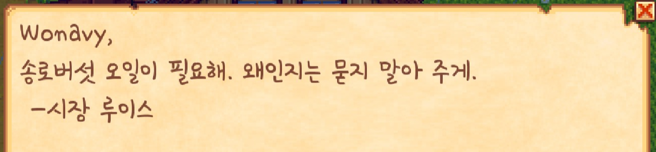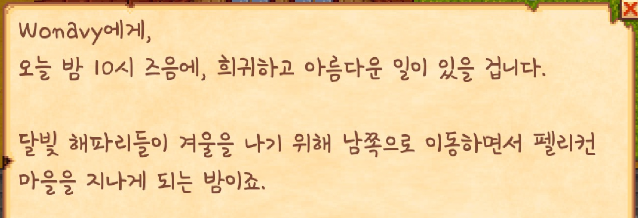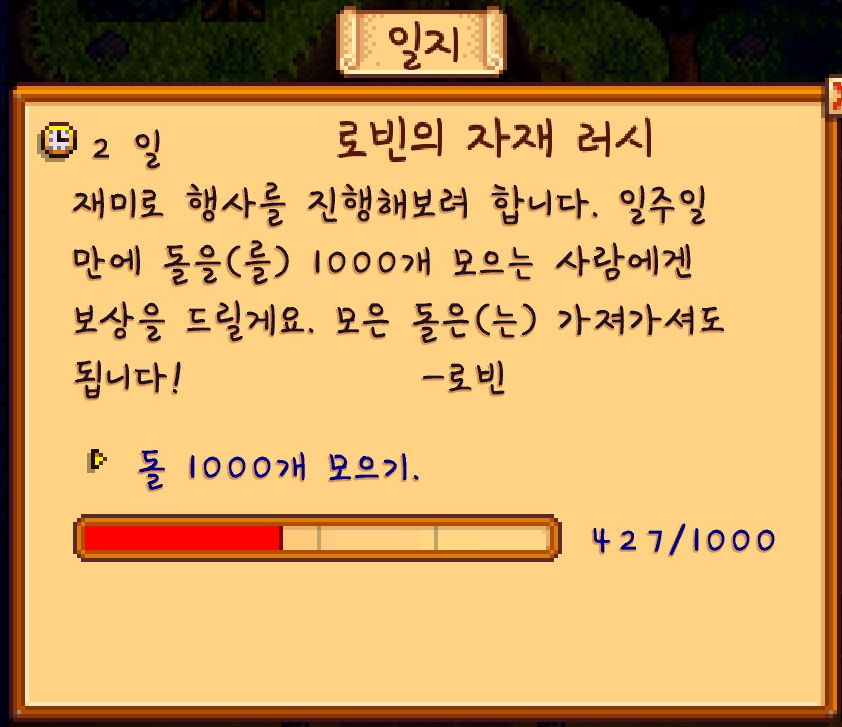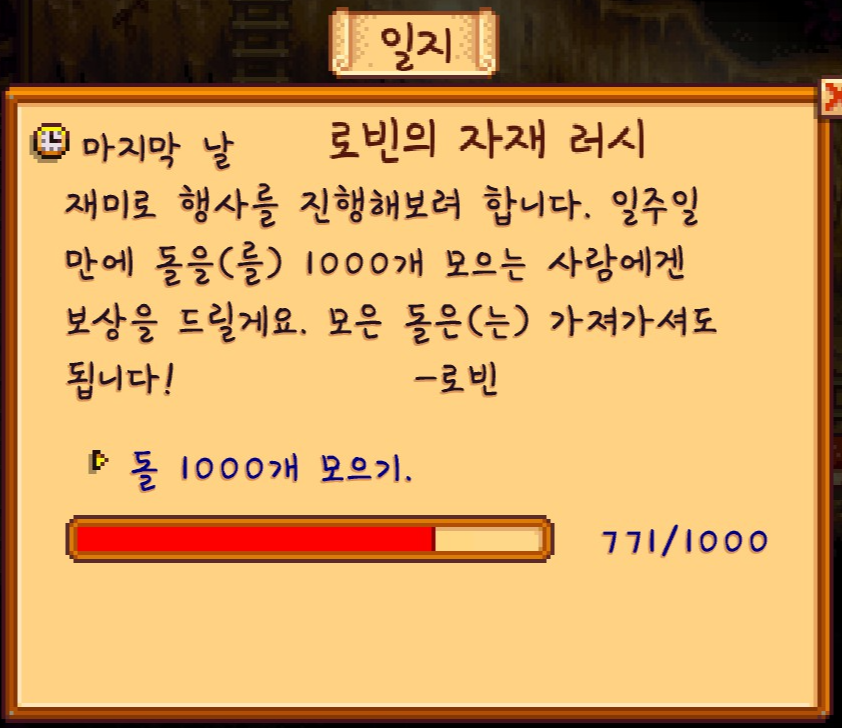 지금까지 스타듀 밸리를 하면서 여기까지 도달한 적이 없어서 그런지 더 의미가 깊었습니다.