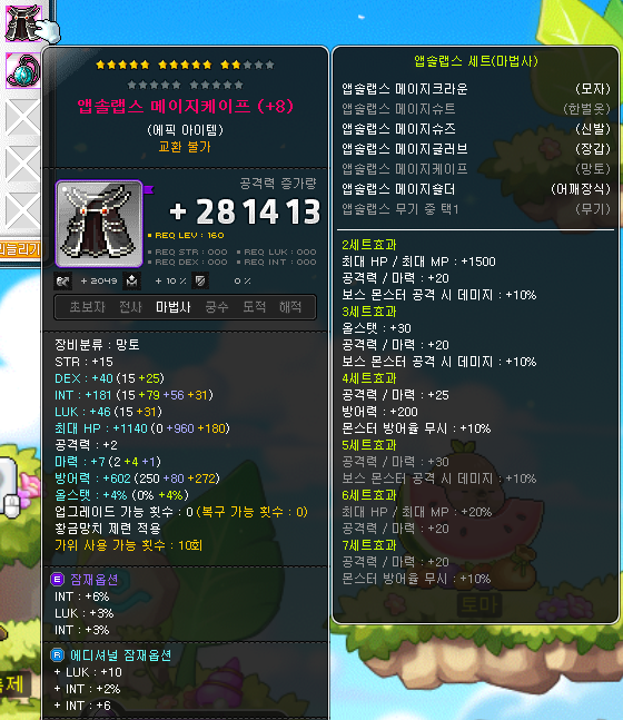 지금까지 가지고 있었던 토드용 모자를 앱솔랩스 모자에 옮겨주고, 임시로 스타포스 12성까지 해줬습니다.