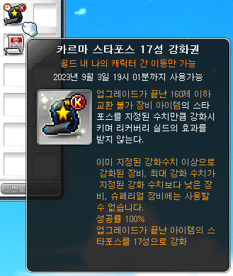 아 그리고 이벤트로 카르마 스타포스 17성 강화권도 얻었는데요. 원래는 아케인 무기에 쓰는 것이 당연히 효과적이겠지만...