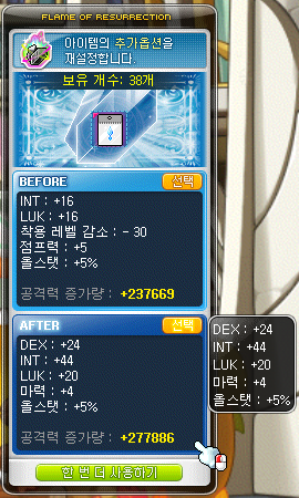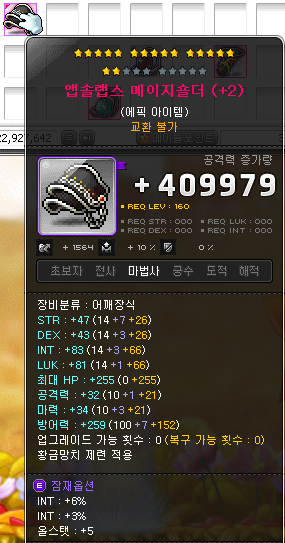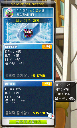 좀 찾아보니까 여명 장신구 쪽에 해주는 것이 가장 좋다고 하는데, 저는 여명 장신구가 아예 없고 주흔 사느라 메소도 다 썼기 때문에 그냥 앱솔 장비에 써줬습니다.