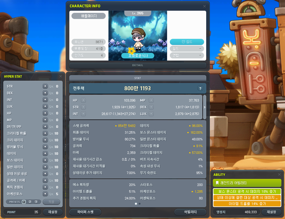 현재 제 배틀메이지 전투력은 800만 정도 됩니다. 아직 제가 노말 스데미를 안 해봐서 모르겠는데, 카파풀을 실수 없이 잘 때리면 2분 정도 나오는 스펙입니다.