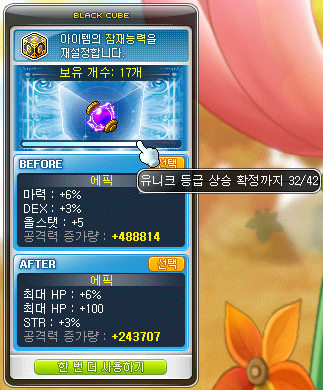 그리고 이벤트로 얻은 블랙 큐브는 그냥 다 써서 천장 쳐서 유니크 보내줬습니다.
