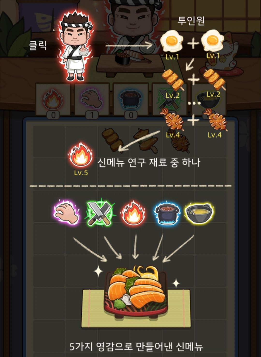 재료들을 합쳐서 영감을 모아서 신메뉴를 랜덤으로 얻을 수 있습니다. 당연히 메뉴의 수가 늘어나면 할 수 있는 요리가 늘어나게 되는데요.