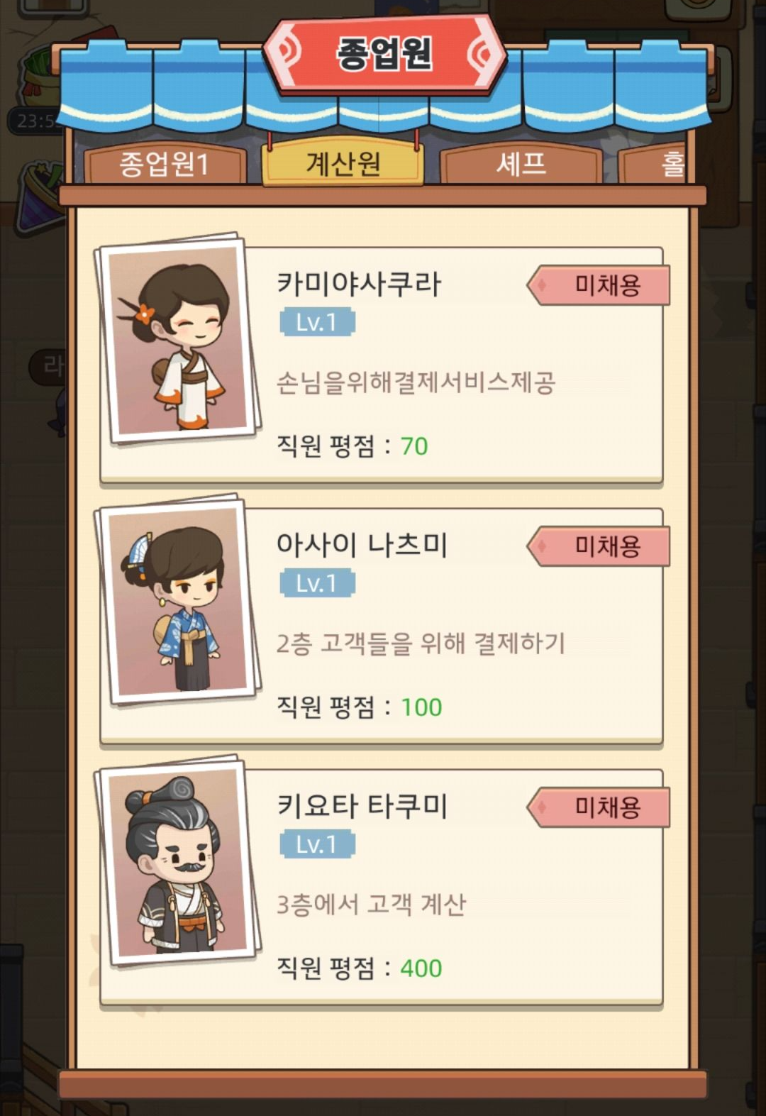 돈을 모아서 종업원을 종류 별로 해금하고 레벨도 올려주고,