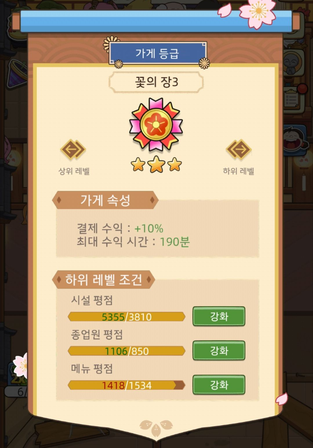 이렇게 가구, 종업원, 메뉴 점수를 충족하면 등급이 오르게 됩니다.