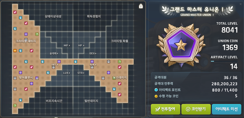 그리고 몬스터 라이프가 삭제되고 새로 들어오게 된 컨텐츠인 '유니온 아티팩트'입니다. 개인적으로는 아주 만족하고 있는데요.