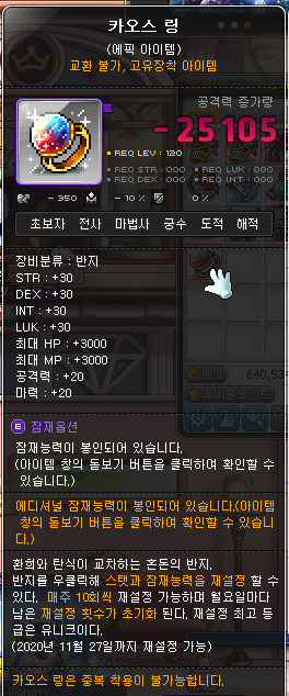 카오스 링은 스탯 +30과 체력/마나 +3000, 공마 +20이 기본 옵션입니다.