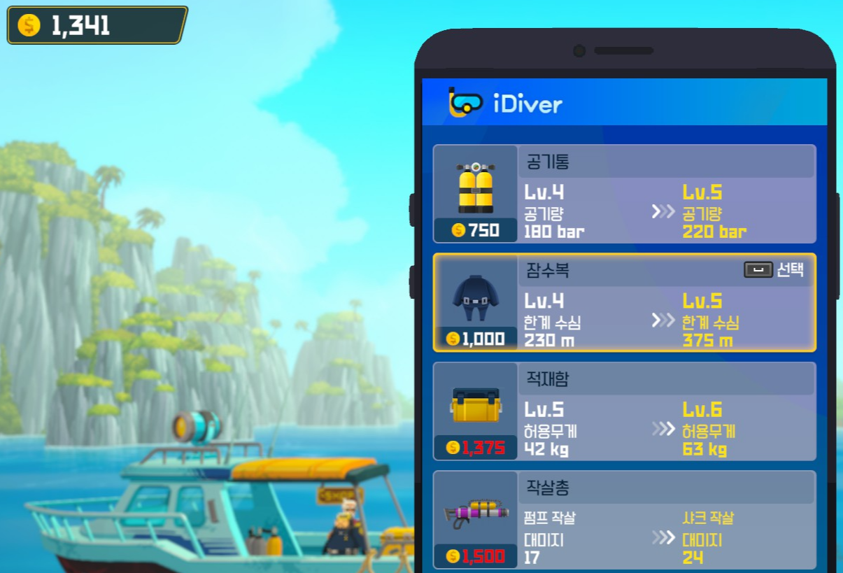 모아둔 돈으로 잠수 장비 업그레이드를 해줬습니다. 이걸 해줘야 바다 속에 더 오래 있을 수 있기 때문에 무조건 필수죠.