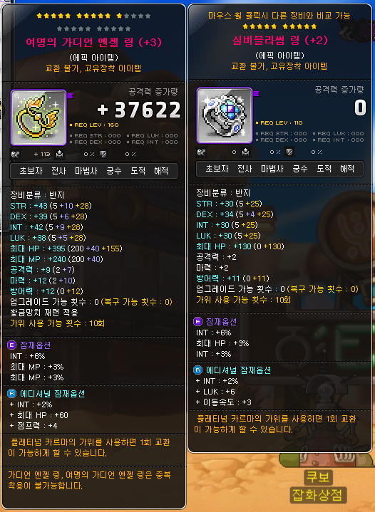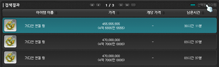 일단 가장 밸류가 낮은 실버블라썸 링을 버리고, '가디언 엔젤 링'을 구매했습니다. 가격은 4.5억 메소 정도 했네요.
