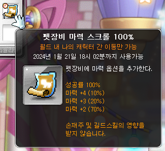 지금 겨울방학 이벤트로 '펫장비 마력 스크롤 100%'을 구매를 할 수 있는데요. 이 주문서를 펫 장비에 사용을 해보려고 합니다. 마력 +4 나와주면 당연히 좋겠지만 귀찮으니 그냥 떡작을 하려고 합니다.