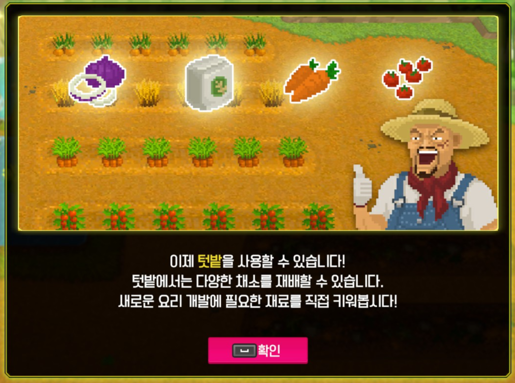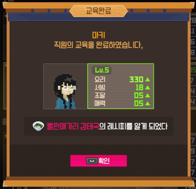 골드가 좀 모여서 직원 레벨을 좀 올렸는데요. 레벨 5를 찍으니까 이렇게 레시피를 얻을 수 있었습니다.