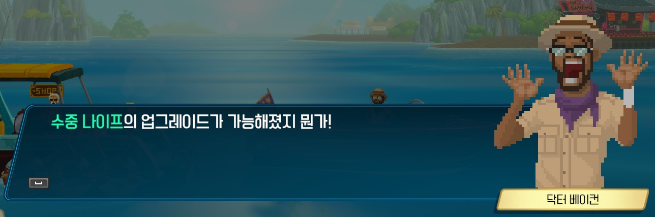 다음 날 닥터 베이컨이 찾아와서 무기도 슬슬 업그레이드를 하라고 합니다. 이제 수중 나이프도 업그레이드를 할 수 있게 되었다고 하는데요.
