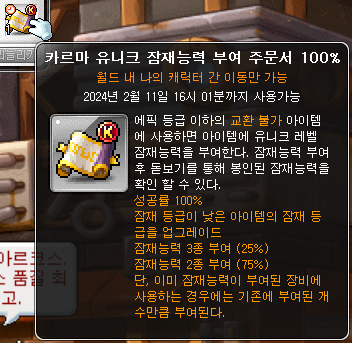 이렇게 '카르마 유니크 잠재능력 부여 주문서'를 얻게 되었습니다.