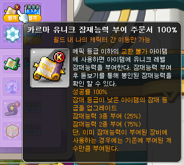 이벤트로 '카르마 유니크 잠재능력 부여 주문서'를 얻게 되었는데요. 크게 바를 곳이 없어서 여명 장신구에 발라줬습니다.