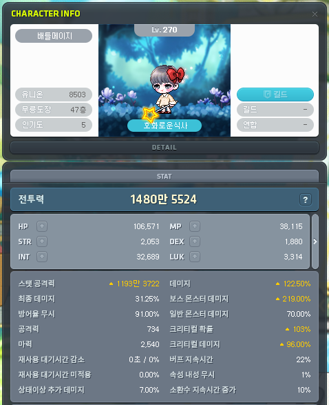 지금은 스탯 3.26, 전투력 1480만이네요. 그동안 발전이 크게 없기는 했습니다.