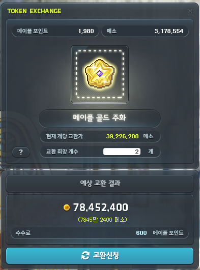 근데 주화를 메소로 바꾸는데에 메이플 포인트가 들더라고요? 여기서 좀 당황을 했는데 보통 경매장 처럼 수수료 느낌으로 로 메소 5% 이렇게 드는 줄 알았는데 그게 아니었습니다...