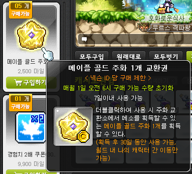 그리고 마일리지 샵에도 주화가 새로 생겨서 앞으로 주간 보스를 잡고 번 돈의 일부는 메포로 바꾸는 작업이 필요해보이네요.