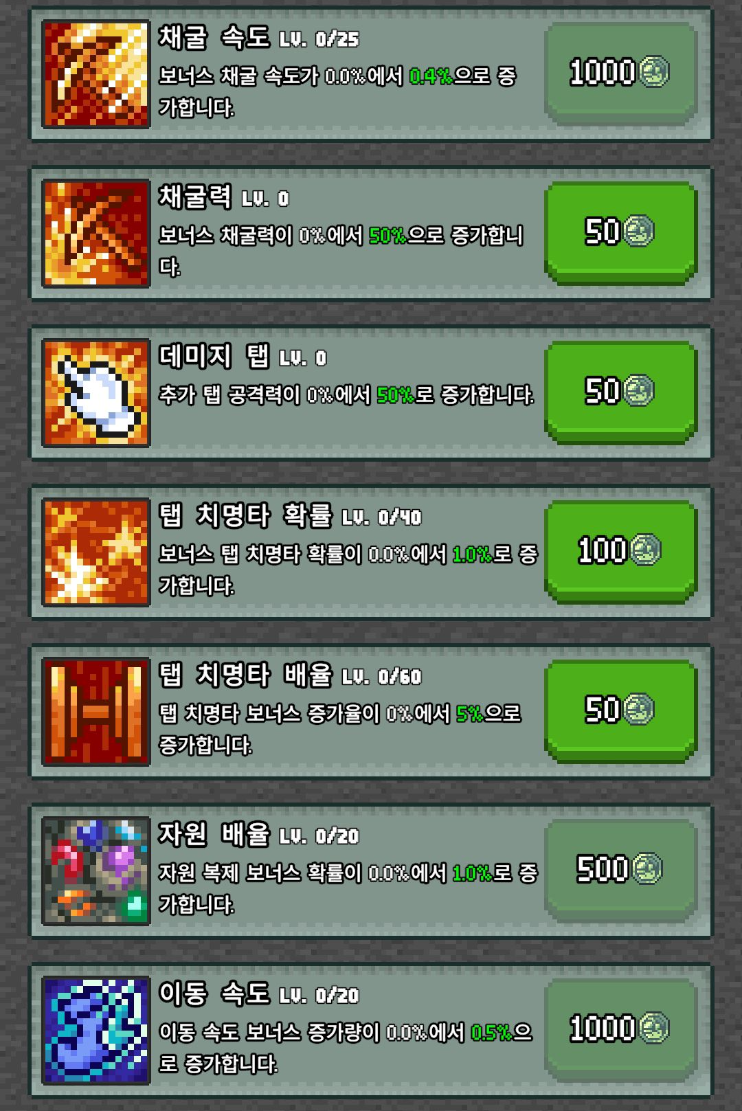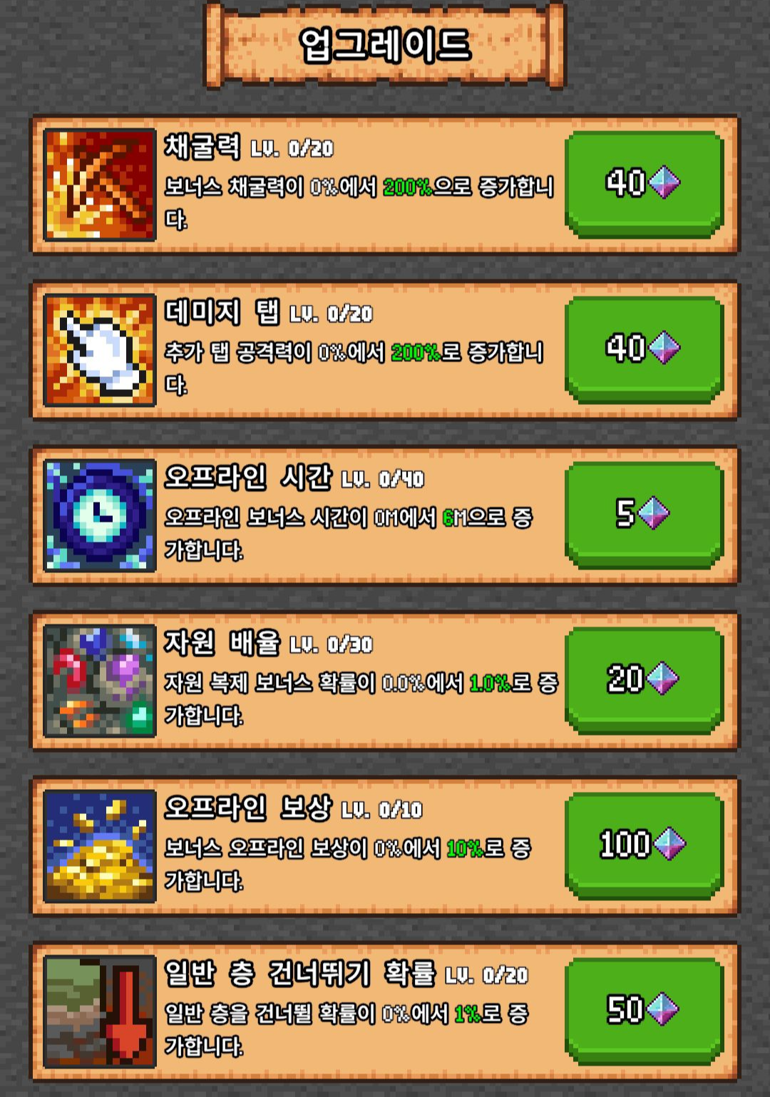 그리고 환생해서 얻은 코인으로 또 업그레이드가 가능합니다. 보석으로도 업그레이드도 가능하고요.