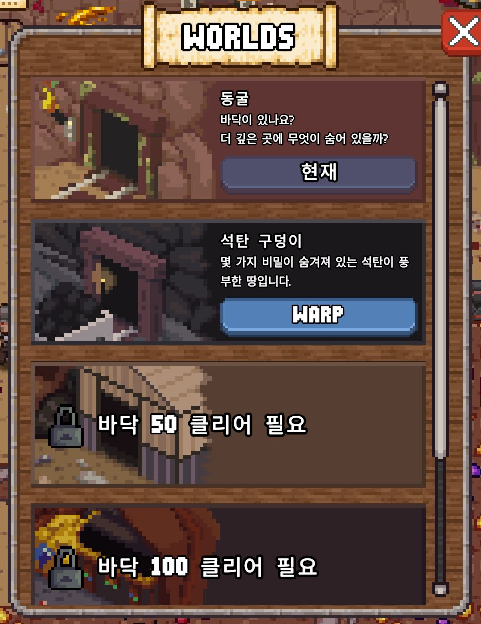 일반 동굴에서는 스테이지를 내려갈수록 초반 광물 얻기가 힘들어 지는데 이런 문제점을 다른 월드에서 보충이 되는 느낌이더라고요.