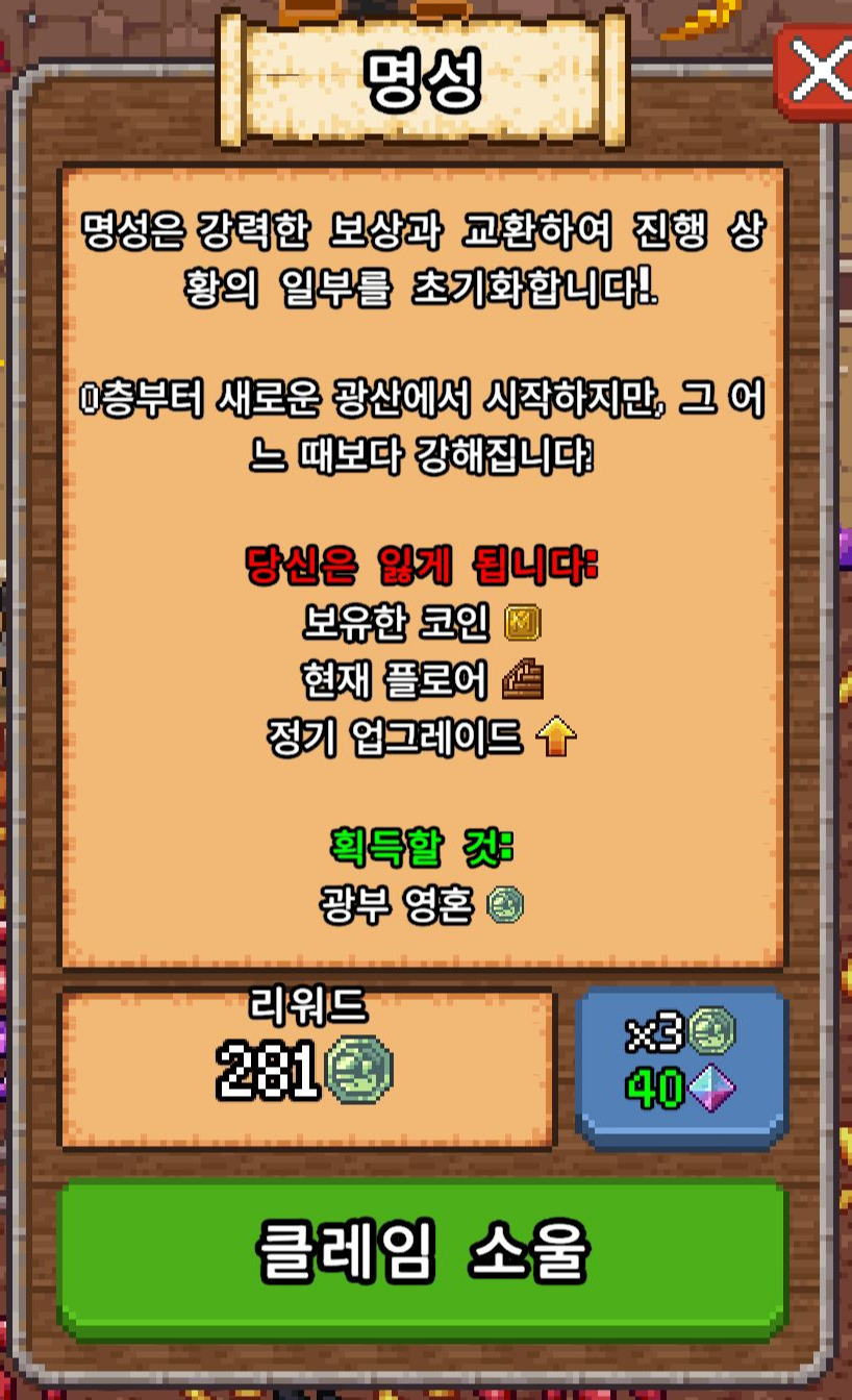 그리고 이 게임은 환생 시스템이 존재해서 최대한 멀리 간 다음에 환생을 해서 다시 내려가는 시스템입니다.