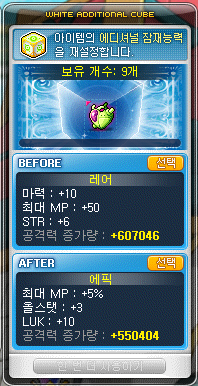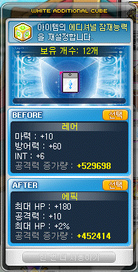 그리고 이벤트로 얻은 '화이트 에디셔널 큐브'를 사용해서 레어 등급을 에픽 등급으로 많이 끌어올렸습니다.