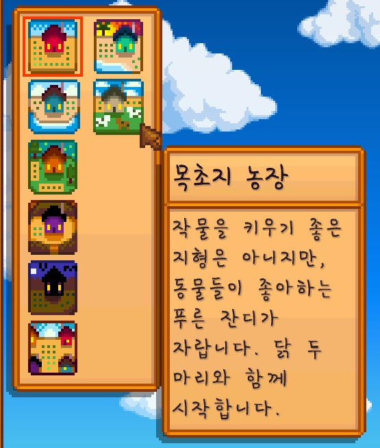 일단 1.6 업데이트로 새로 생긴 '목초지 농장'에서 플레이 할 생각입니다. 기본적으로 닭 두마리가 주어지고, 동물들이 좋아하는 푸른 잔디가 자란다고 하는데요.