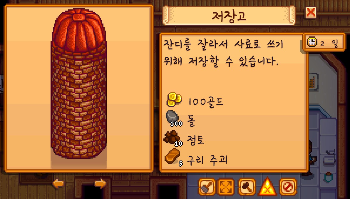 슬슬 인프라를 갖춰야 했는데요. 일단 동물들이 먹을 건초를 보관할 저장고를 먼저 건설하기로 했습니다.