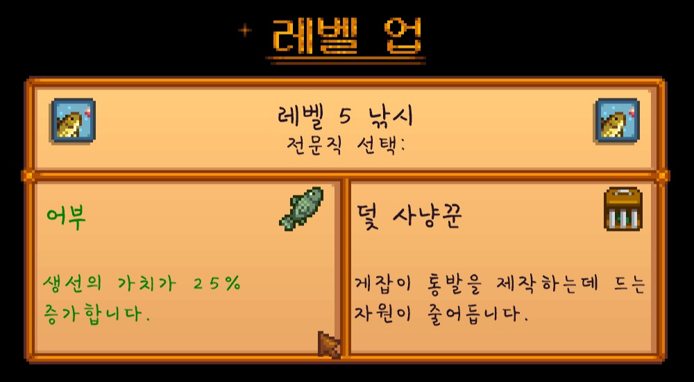 그래서 그런지 낚시를 먼저 5레벨을 찍게 되었는데요. 당연히 여기서 생선의 값어치를 올려주는 '어부'를 선택했습니다.