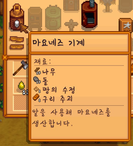 마요네즈 기계를 만들었습니다. 앞으로 동물을 더 키울 예정이라 많이 필요한 예정인데 땅의 수정을 구하는게 생각보다 쉬운일이 아니더라고요.