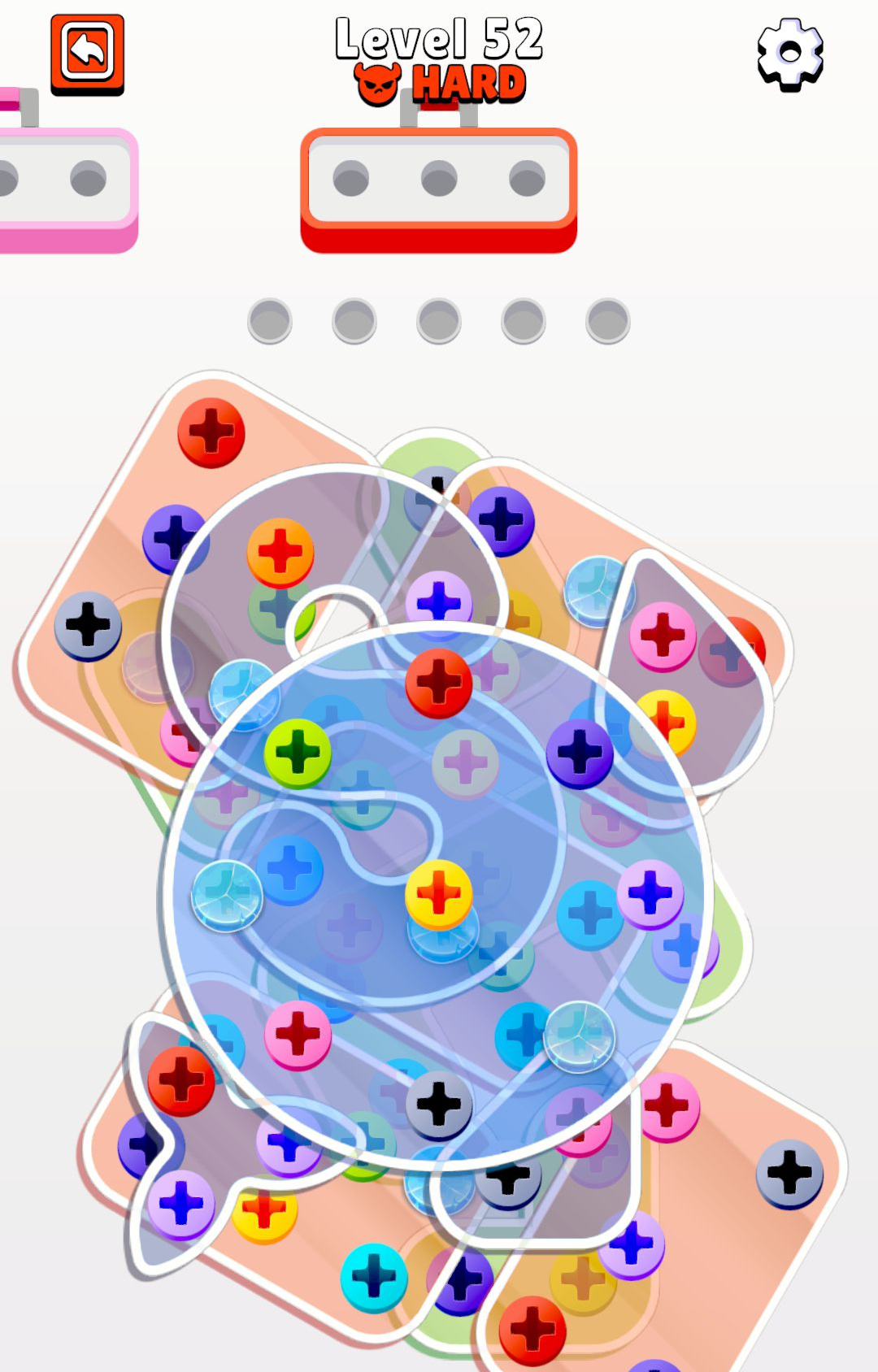 게임을 시작하게 되면 이렇게 정중앙에 나사가 박혀 있는데요. 터치를 해서 누르면 위쪽에 쌓이게 되고 같은 색깔 나사를 케이스에 맞춰서 모으면 해결이 되는 방식입니다.