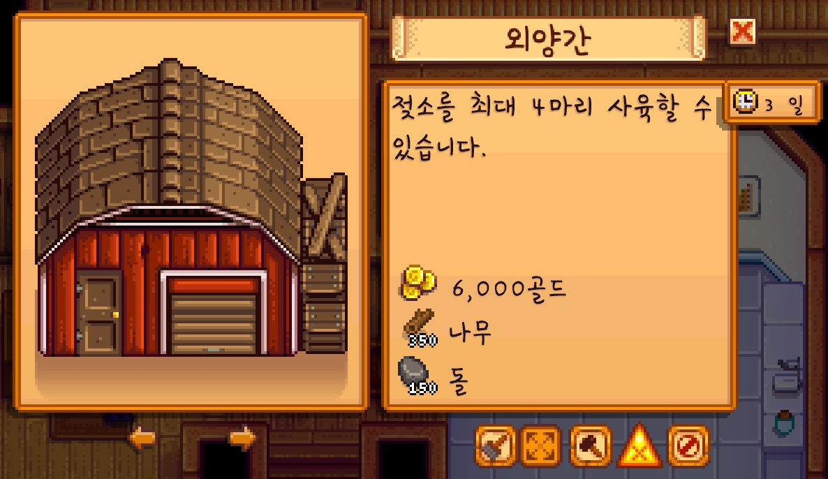 그리고 재료를 모아서 '외양간' 건설 의뢰를 맡겼습니다. 돼지를 많이 키워야 돈을 벌 수 있기 때문에 여러개 만들지 않을까 싶네요.
