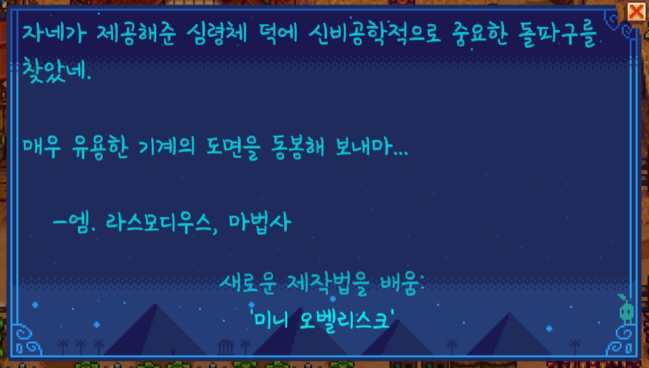어제 마법사에게 심령체를 가져다주는 퀘스트를 완료하니 '미니 오벨리스크' 제작법을 배웠습니다.