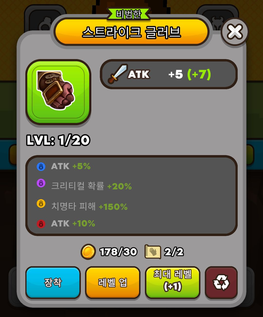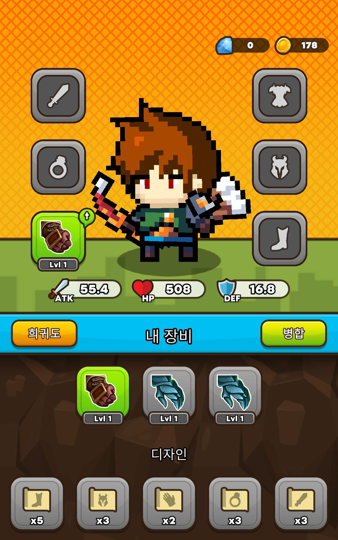 그리고 장비의 등급을 올리고 레벨을 올려서 스펙을 올릴 수도 있습니다. 같은 등급 장비 3개를 모으면 상위 등급으로 바꿔먹을 수 있고요.