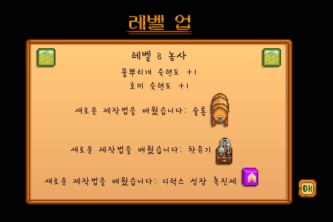 농사 8레벨을 달성해서 술통을 제작할 수 있게 되었습니다. 하지만 저는 목축을 주로 할 예정이기 때문에 착유기가 더 많이 만들지 않을까 싶네요.