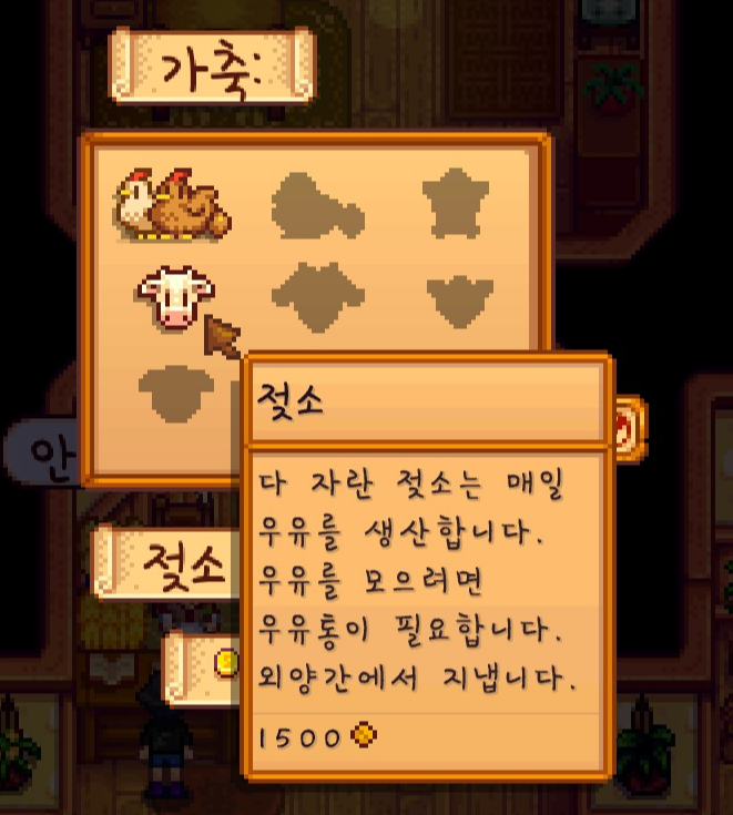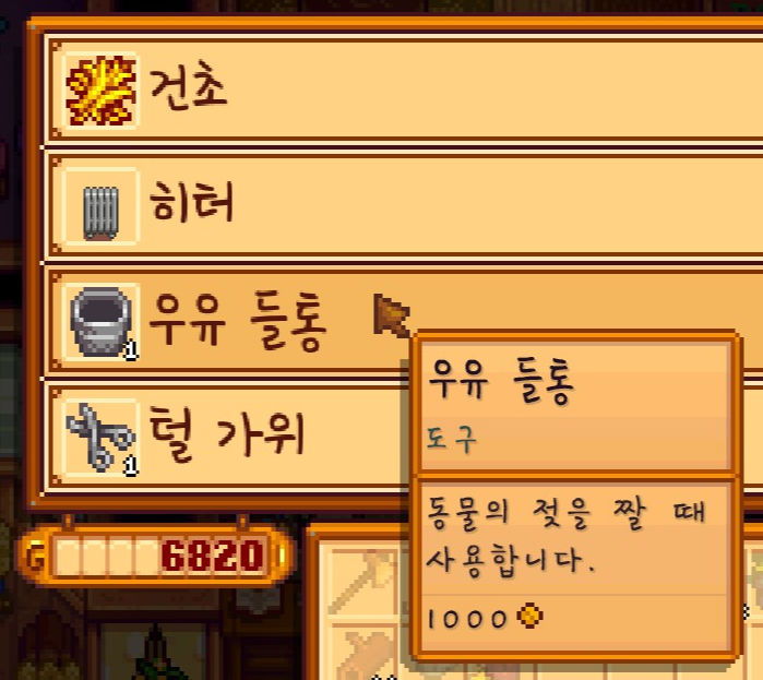 마니를 찾아가 젖소를 구매하고, 우유 들통도 겸사겸사 구매 해줬습니다.