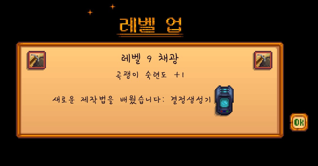 드디어 채광 9레벨을 달성했는데요. 광물을 복사해주는 결정생성기를 얻었습니다.