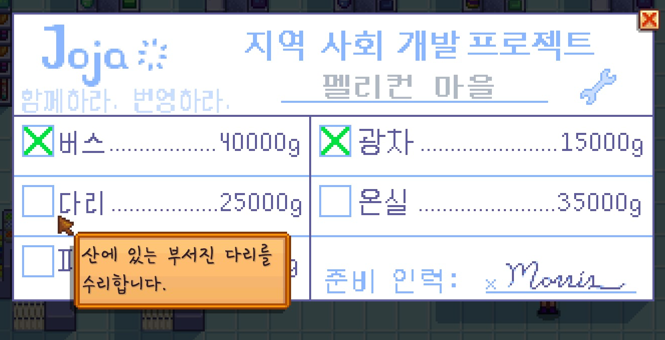 그리도 드디어 돈을 끌어모아서 지역 사회 개발 프로젝트를 하나 할 수 있게 되었는데요. 이번에는 '다리'를 수리해보기로 했습니다.