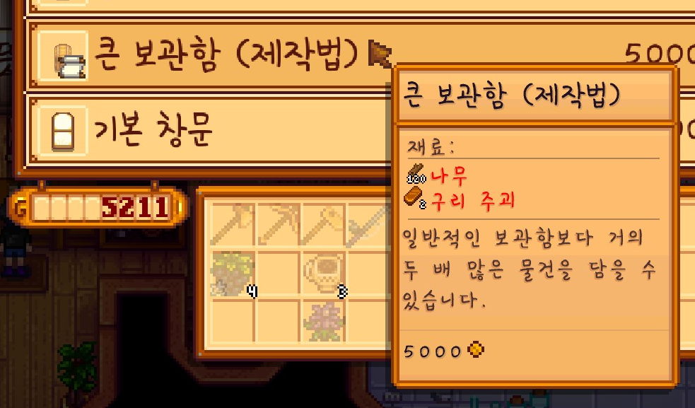스타듀 밸리 1.6 패치를 통해 '큰 보관함'이 새로 생겼는데요. 기존 상자보다 두 배 더 많이 들어간다고 합니다.