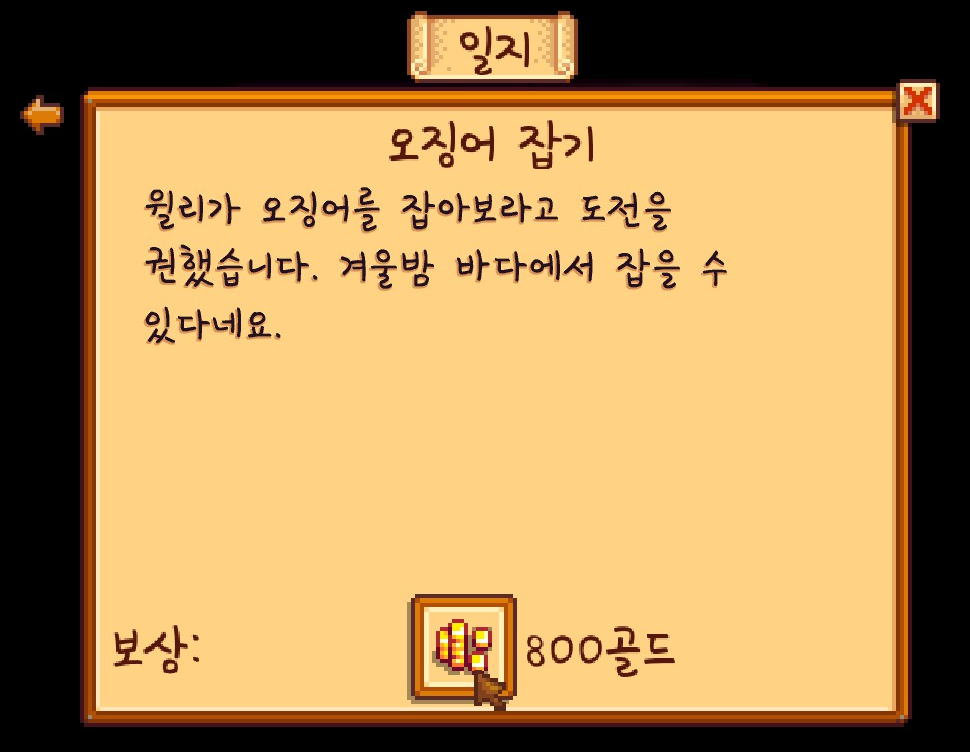 마침 어제 오징어를 잡았었는데, 퀘스트 중에 오징어를 가져다주는 퀘스트가 있어서 겸사겸사 바로 수행했습니다.