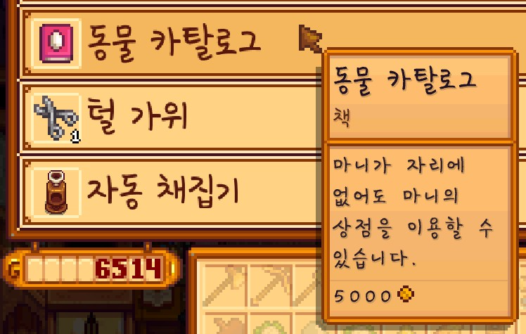 그리고 번 돈으로 자동 채집기를 구매해 주고, 동물 카탈로그도 같이 구매했습니다.