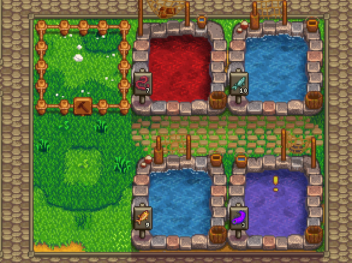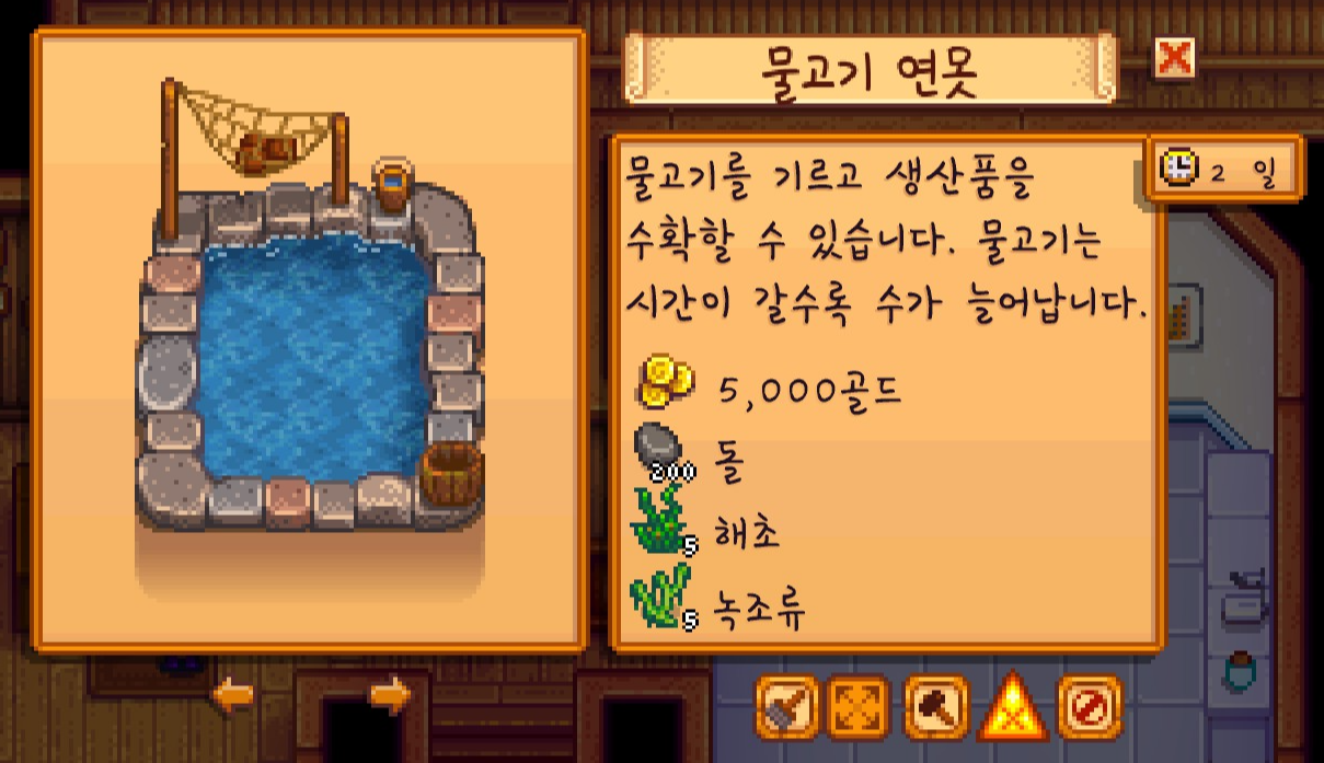 새로 완공된 물고기 연못에는 게를 넣을 생각입니다. 제가 알기로는 게 10마리 양식하면 진주를 얻을 수 있는 이벤트가 있는 걸로 아는데 한번 받아볼 생각입니다.